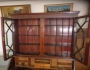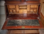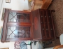 | Tmavá dřevěná komoda s šuflaty a výklopným stolkem a horní prosklenou skříní či vitrínou, možnost na přepravu rozdělat na 2 části. Spodní část má 3x šufle a v horní části výklopnou skříňku, která vytvoří pracovní stolek, uvnitř je dřevěný pořadač, který lze zcela vyjmout. Horní část má prosklenné dveře a uvnitř police., hloubka horní části 25 cm, výška pouze spodní části 109 cm, celkově zachovalé, pouze několik menších vad - na výklopné části jsou 2 praskliny na laku viz. poslední detailní foto, zámky u šuflat a dvířek mají dohromady 2 klíče, ale jsou zatuhlé a nelze je zamykat, různě menší odřeniny |