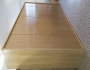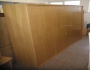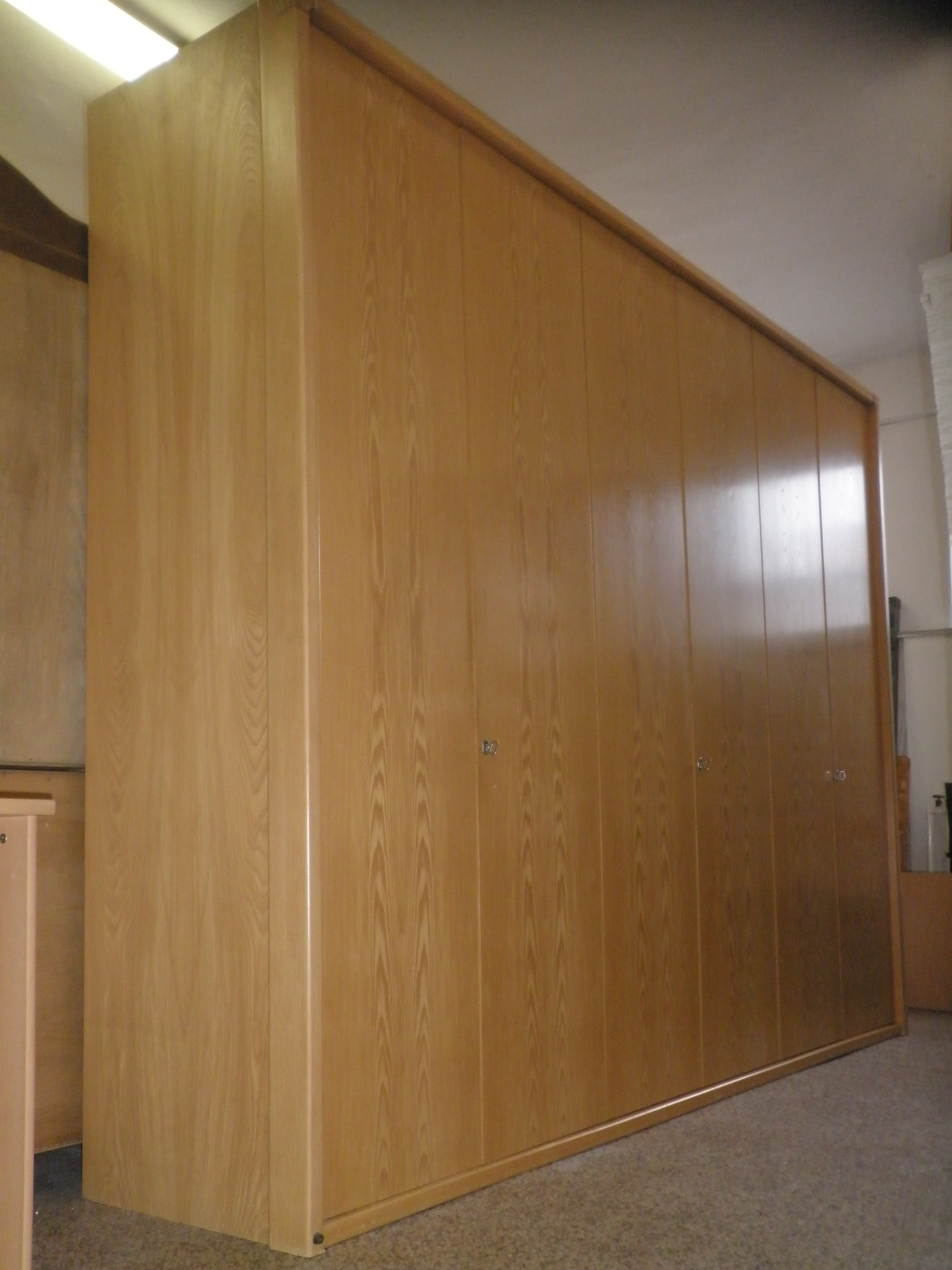 | Dlouhá světlá šatní skříň, rozložitelná pro přepravu ale je to velmi stabilní a pevné provedení (desky mají trochu větší váhu), rozdělena je do 3 částí a každá tato část má uvnitř 2x polici a 1x šatní tyč, desky mají otvory pro různé nastavení polic nebo případně je možnost i přidat do skříně další police, skříň je celkově velmi zachovalá, má pouze pár menších odřenin např. vedle uzamykání klíčů viz. foto a pak u prvních dveří nefunguje zámek a dveře se přichytávají suchým zipem viz. foto (možná oprava zámku) |