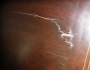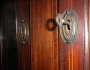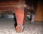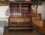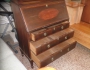 | Tmavá dřevěná komoda s šuflaty a výklopným stolkem a horní prosklenou skříní či vitrínou, možnost na přepravu rozdělat na 2 části. Spodní část má 3x šufle a v horní části výklopnou skříňku, která vytvoří pracovní stolek, uvnitř je dřevěný pořadač, který lze zcela vyjmout. Horní část má prosklenné dveře a uvnitř police., hloubka horní části 25 cm, výška pouze spodní části 109 cm, celkově zachovalé, pouze několik menších vad - na výklopné části jsou 2 praskliny na laku viz. poslední detailní foto, zámky u šuflat a dvířek mají dohromady 2 klíče, ale jsou zatuhlé a nelze je zamykat, různě menší odřeniny |